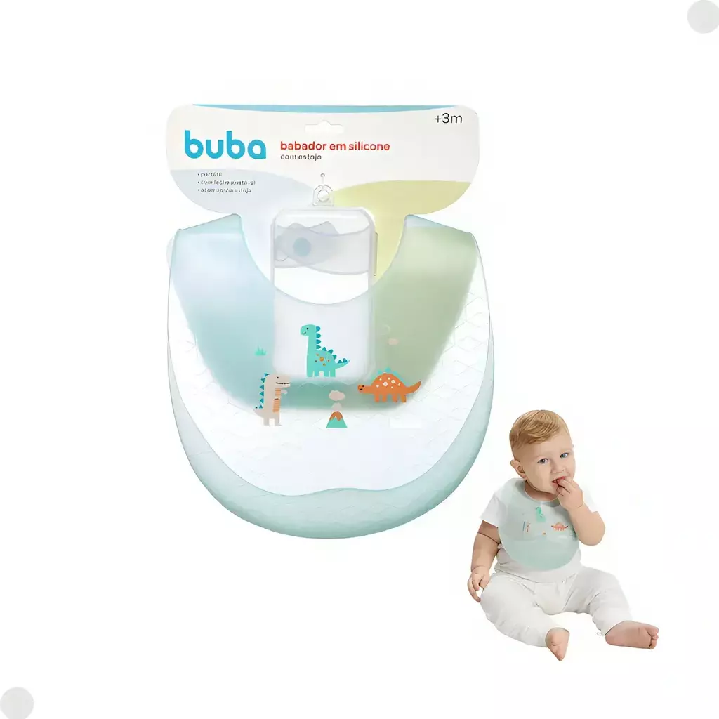 Trazendo um estojo que facilita na hora de transportar, o Babador de silicone da Buba é ideal para levar a qualquer lugar. Superleve, maleável e livre de BPA, se ajusta perfeitamente ao pequeno e garante maior conforto e praticidade. Já o seu bolso coletor, como o próprio nome diz, evita que as migalhas dos alimentos caiam no chão e resultem naquela famosa bagunça que os pequenos adoram, mas você nem tanto, né? - Contém: 1 Babador e 1 Estojo. - Idade recomendada: A partir de 3 meses. - Composição: Babador: 100% Silicone. Estojo: 100% Polipropileno (PP). - Livre de BPA e ftalatos. Produto 100% atóxico. Aviso legal • Idade mínima recomendada: 3 meses.